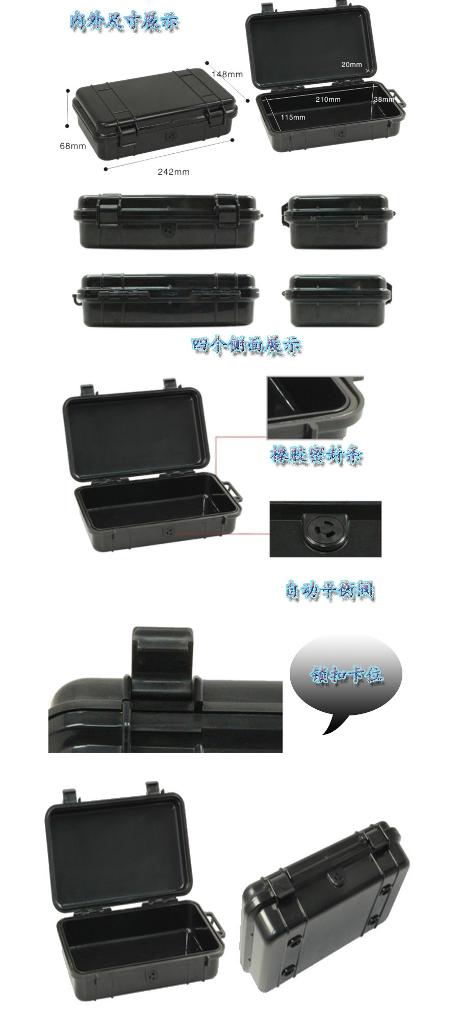 簡要說明:廣泛用于傳媒、公安、消防、軍隊、航空、戶外攝影、野外考察、科學(xué)探測等眾多領(lǐng)域的高端儀器、儀表。具有高強度、高抗壓沖擊、防潮、絕對密封、防塵、防水等特點。產(chǎn)品材質(zhì):ABS原料,箱體采用高抗沖擊的高分子聚合材料一體注塑成型,密封采用扁型彈性發(fā)泡密封橡膠條,確保防水氣密,所有較軸均采用不銹鋼材質(zhì)。