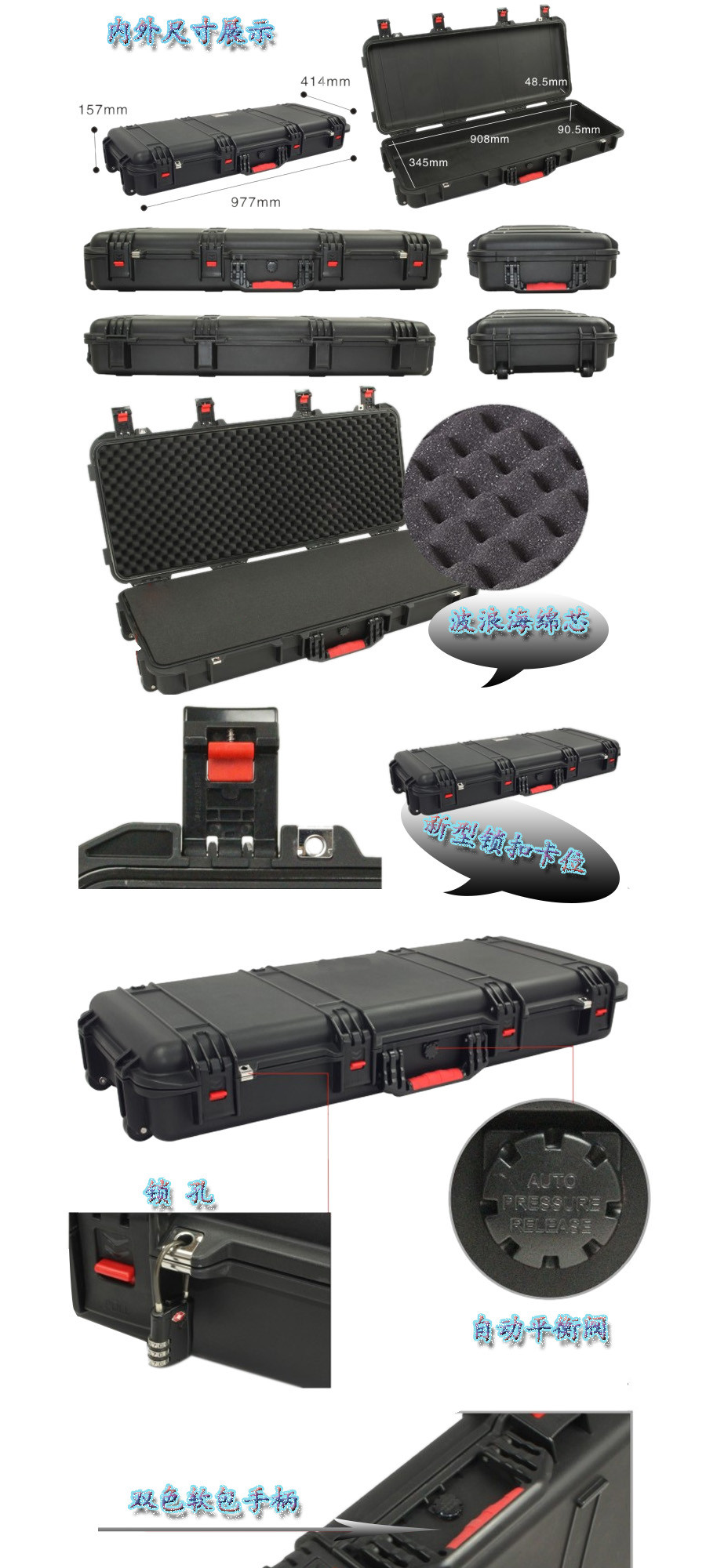 簡(jiǎn)要說明:廣泛用于傳媒、公安、消防、軍隊(duì)、航空、戶外攝影、野外考察、科學(xué)探測(cè)等眾多領(lǐng)域的高端儀器、儀表。具有高強(qiáng)度、高抗壓沖擊、防潮、絕對(duì)密封、防塵、防水等特點(diǎn)。產(chǎn)品材質(zhì):ABS原料,箱體采用高抗沖擊的高分子聚合材料一體注塑成型,密封采用扁型彈性發(fā)泡密封橡膠條,確保防水氣密,所有較軸均采用不銹鋼材質(zhì)。