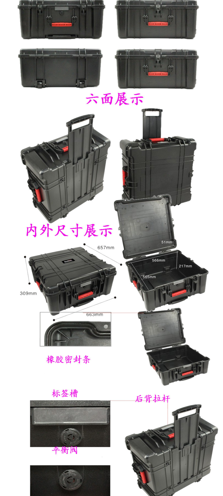 簡要說明:廣泛用于傳媒、公安、消防、軍隊、航空、戶外攝影、野外考察、科學(xué)探測等眾多領(lǐng)域的高端儀器、儀表。具有高強(qiáng)度、高抗壓沖擊、防潮、絕對密封、防塵、防水等特點(diǎn)。產(chǎn)品材質(zhì):ABS原料,箱體采用高抗沖擊的高分子聚合材料一體注塑成型,密封采用扁型彈性發(fā)泡密封橡膠條,確保防水氣密,所有較軸均采用不銹鋼材質(zhì)。